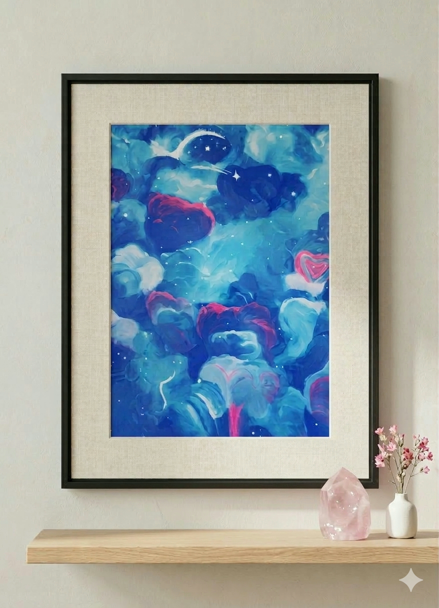 This is 1 of 2 prints from the original canvas piece "Butterfly Kisses." I chose this moment in time as a perfect display of love, tranquility, yearning, & inner knowing. Love is not defined by distance, color, form, or the "Astral" plane. Love will always find a way. Through the 3d, 4d, 5d, & beyond.